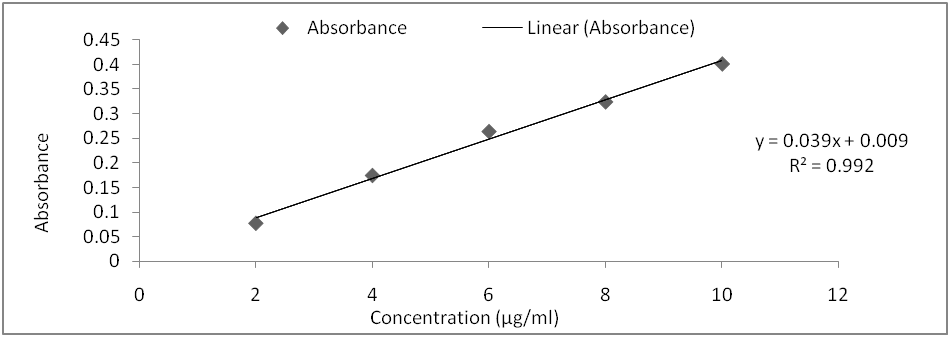 . Where, y = Absorbance, x = concentration of drug (µg/ml), m = gradient and c = intercept. A standard calibration graph of crude extract (fig. 1) was plotted between absorbance and concentration using the computer interface [18].