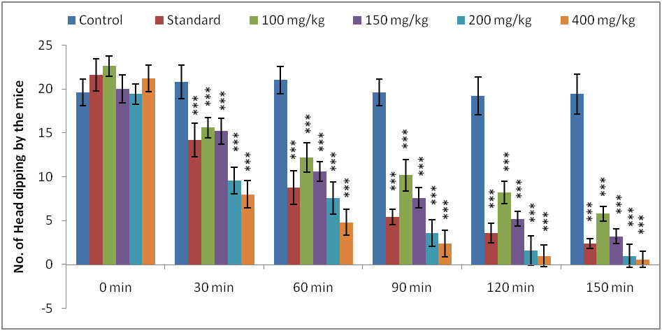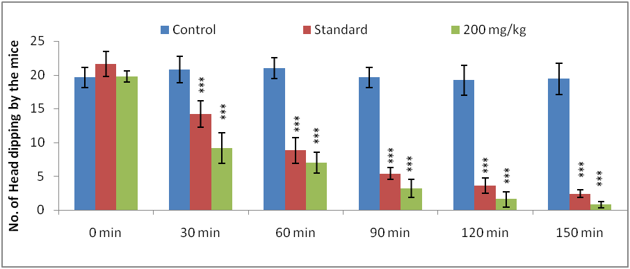 The lyophilized product was also evaluated for CNS activity through the hole board test at the dose of only 200 mg/kg body weight. In the hole-board test, the propensity of head dips significantly (p<0.001) lessened in a time-dependent manner in the mice treated with developed formulation at the dose of 200 mg/kg while compared with the control group (fig. 9).