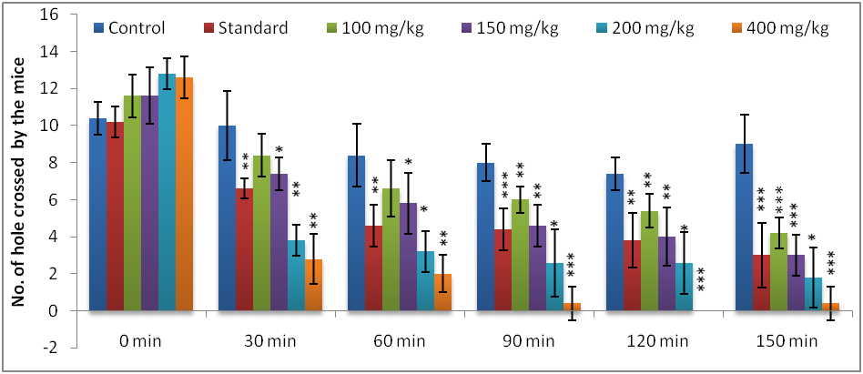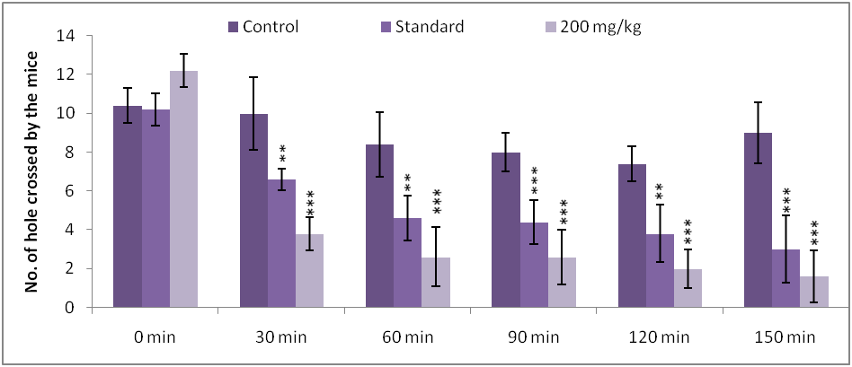 We noticed that the hole cross activity significantly (p<0.001) abridged by second (30 min) and continued to sixth (150 min) observation period in comparison with the control group (fig. 3). The number of hole cross lessened significantly (p<0.001) demonstrated for the fourth (90 min), fifth (120 min), and sixth (150 min) observation period at 200 mg/kg body weight. Also, the positive control group (diazepam 1 mg/kg) decrement showed a similar modification to that observed with the extract.