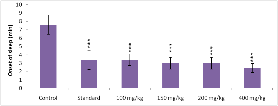 Fig. 4: Time to induce sleep on thiopental sodium induced sleeping time test, all values are expressed as the mean±standard deviation of the mean (SDM), n=5. The difference between groups was analyzed by one-way ANOVA. *p<0.05, **p<0.01 and **p<0.001 were considered to be statistically significant