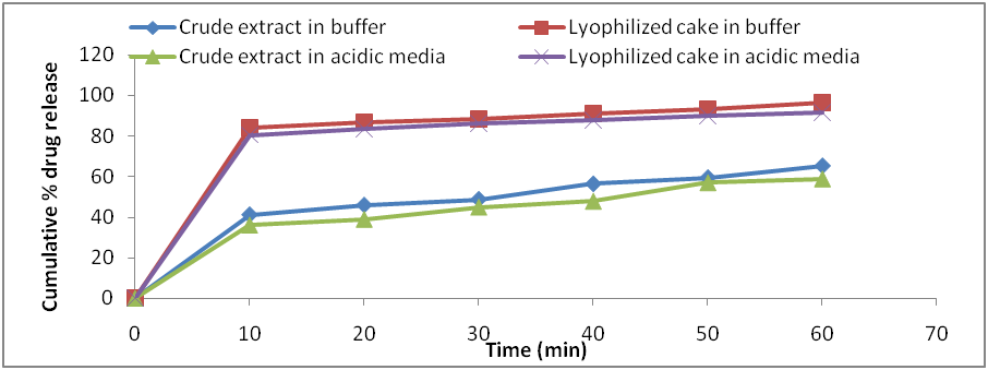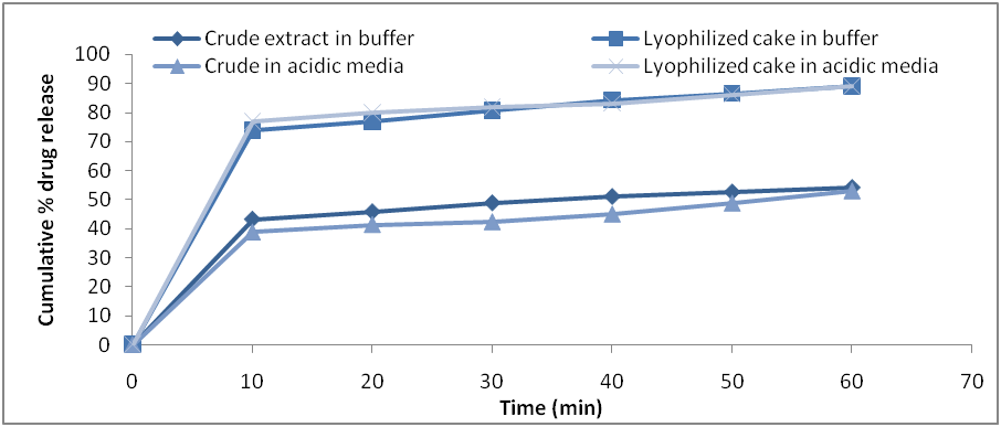 The dissolution profile of crude extract and optimized oral lyophilized cake were determined in a dissolution tester (Veego, India). All tests were conducted in 900 ml of 0.1N HCl and phosphate buffer medium, pH 6.8 maintained at 37±0.5 °C with a paddle rotation speed at 100 rpm. After specified time intervals (10, 20, 30, 40, 50, and 60 min), 5 ml samples from the dissolution medium were withdrawn with the help of a pipette and 5 ml of fresh medium was added quickly again in the dissolution medium. Then, the withdrawn sample was filtered and assayed for drug content by using UV spectrophotometer at 216.9 nm wavelength (Hitachi U-2900 spectrophotometer, Japan). The percentage of drug dissolved from the preparations was calculated using calibration equations [19].