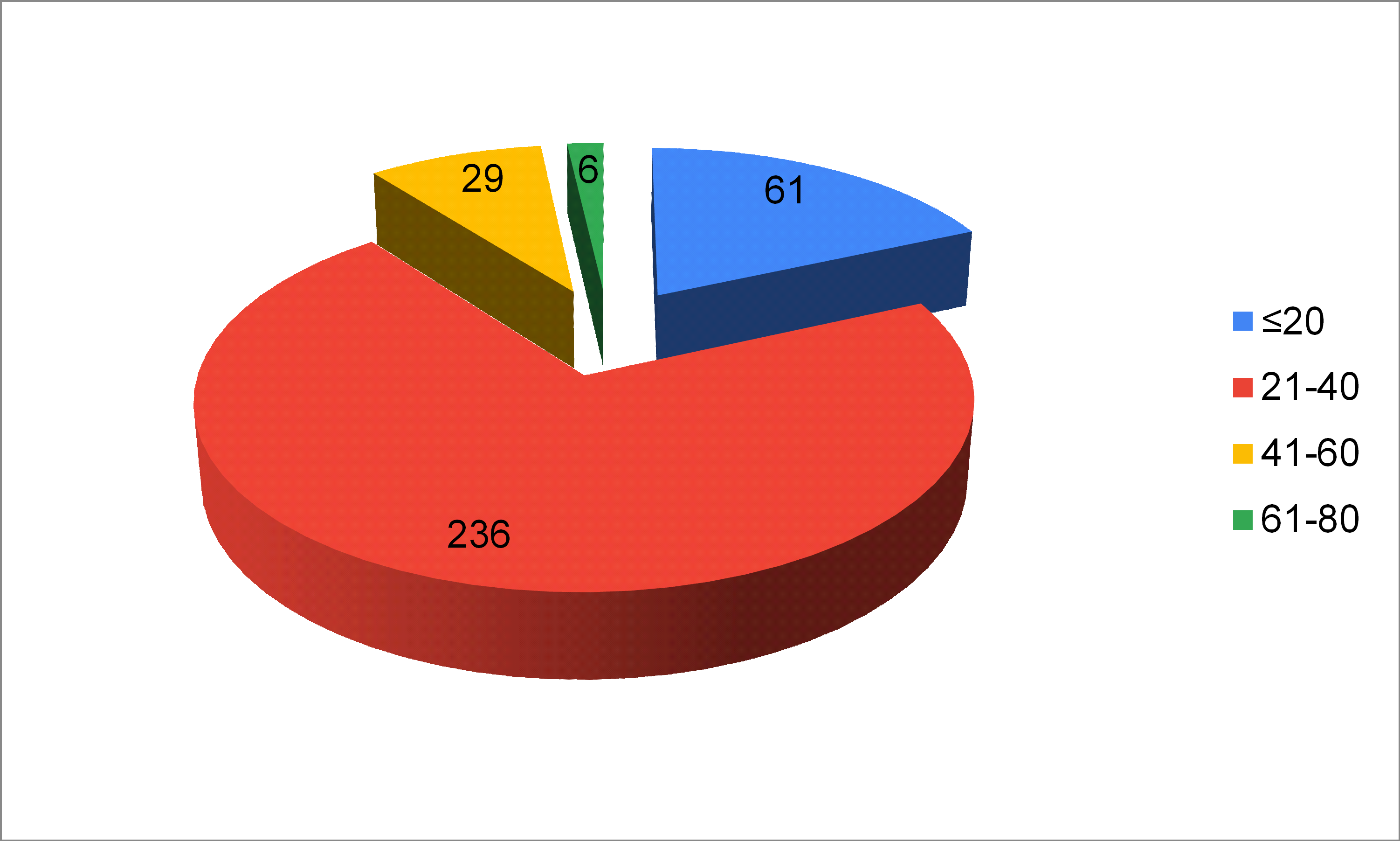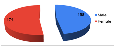 The total number of subjects was 332. Out of which, female participants were dominated 174(52.4%) and male participants were 158(47.59%). This is depicted in fig. 1.