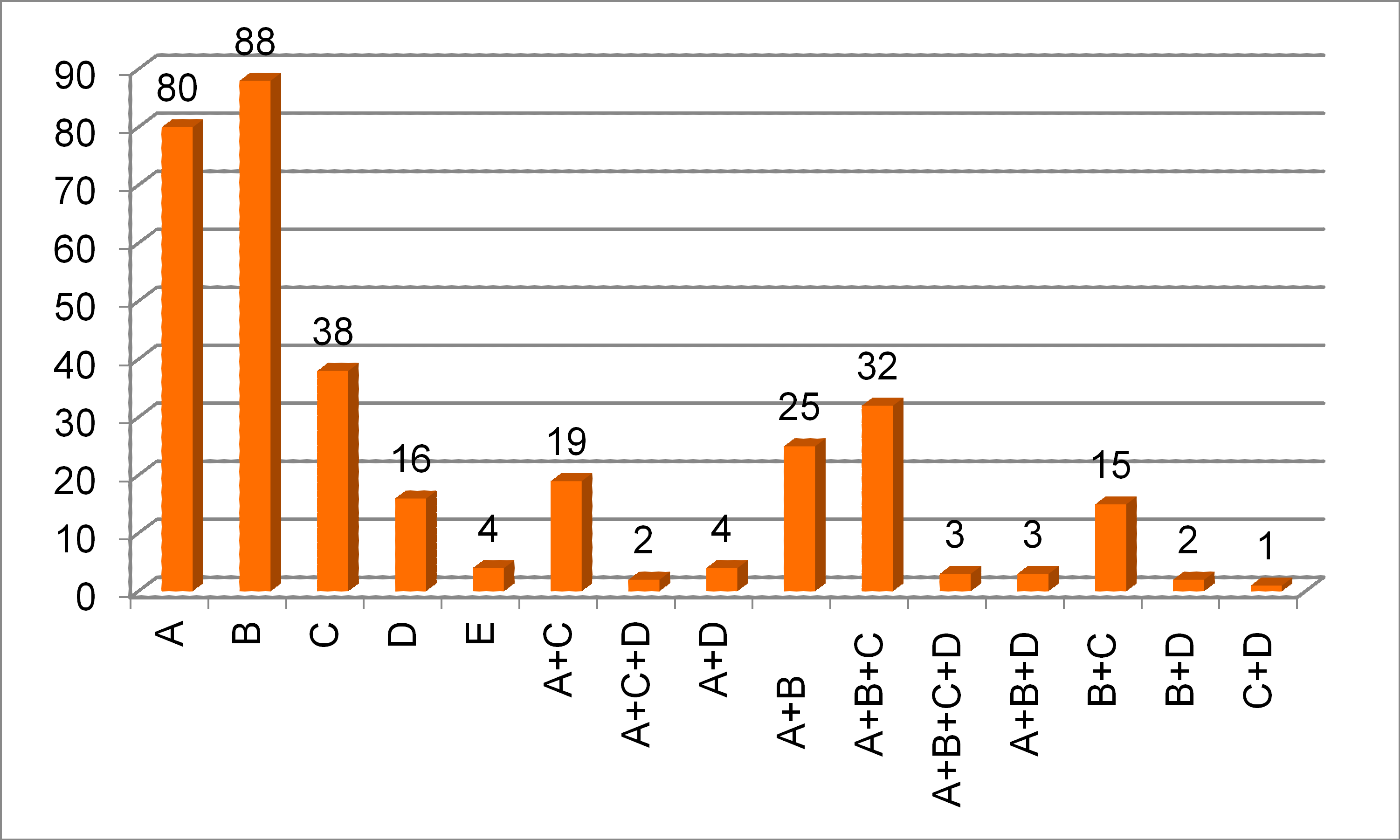 Fig. 12: Subjects with different treatment, In this bar chart, A-Dressing (dry/moist) B-Ointment (for external use) C-Any medication (antibiotics, painkiller etc.) D-Home remedies E-No treatment