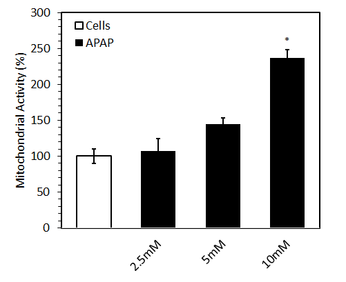 Fig. 1: Percentage of mitochondrial electron transport capacity of hepatocytes exposed to different doses of APAP (2.5, 5 and 10 mmol) over a period of 2 h, Each data point represents the mean±SEM (n=8 wells). 10 mmol APAP had significantly increased the mitochondrial electron transport capacity of hepatocytes. *p<0.05