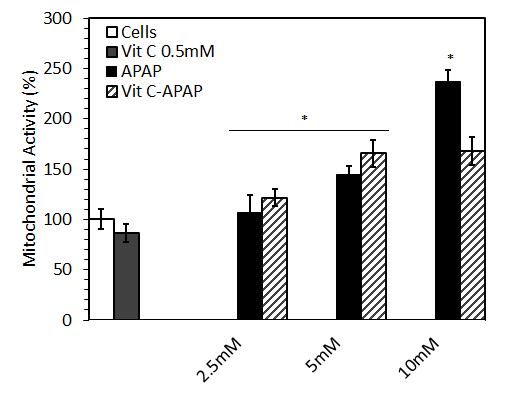 Fig. 2: The hepatoprotection produced by Vit C (0.5 mmol) on cells treated with different doses of APAP (2.5 mmol, 5 mmol and 10 mmol). The data shows that Vit C significantly reduced APAP-induced increase in cell mitochondrial electron transport capacity in 10 mmol APAP-treated hepatocytes. *p<0.05