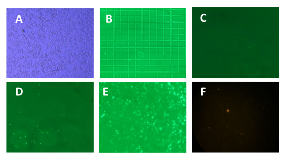 Fig. 3: Representative images of isolated primary mouse hepatocyte stained with Annexin V and PI. (A) Untreated cells visualized on the normal light bright field; (B) Untreated hepatocytes visualized on fluorescent Green Filter; (C) Cells treated with Vit C (Green Filter) showing normal intensity of Annexin V staining; (D) APAP treated hepatocytes (Green Filter) showing the high intensity of Annexin V staining; (E) Vit C-APAP treated hepatocytes (Green Filter) indicating reduced intensity compared to APAP alone; (F) PI staining of APAP treated hepatocytes visualized on Texas Red Filter. All images were captured as original objective 40x