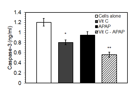 Fig. 4: Caspase-3 concentration of isolated mouse hepatocytes as determined by ELISA. Cells were either untreated, treated with 0.5 mmol Vit C only, treated with 10 mmol APAP alone, or treated with 10 mmol APAP after pretreatment with 0.5 mmol Vit C. Data are expressed as units for caspase-3 activity, and represent means±SEM, n=6. In comparison to APAP (**p<0.05). In comparison to Cells alone (*p<0.05)