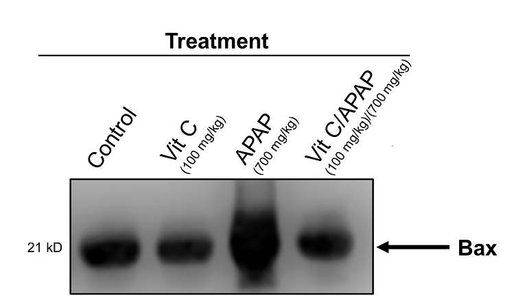 Fig. 5: Serum bax levels determined by Western Blotting in APAP-induced toxicity and effects of Vit C pretreatment. Mice groups were either untreated, treated with 700 mg/kg APAP alone or 100 mg/kg Vit C, and treated with 700 mg/kg APAP after pre-treated with 100 mg/kg Vit C