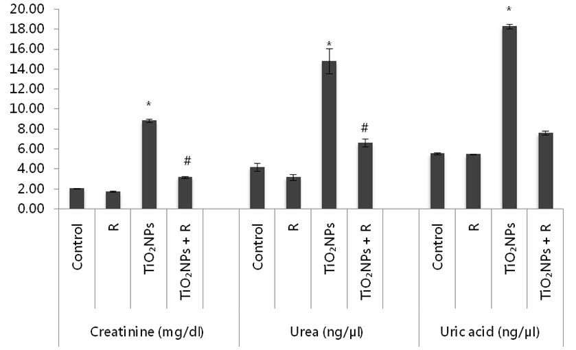 Fig. 1: Effect of rutin (R) on creatinine, urea, and uric acid levels in serum of titanium dioxide nanoparticles (TiO2NPs)-treated mice. Data are expressed as mean±standard error (n=10). *(P<0.05): significant difference from the control group, #(P<0.05): significant difference from the TiO2NPs treated group