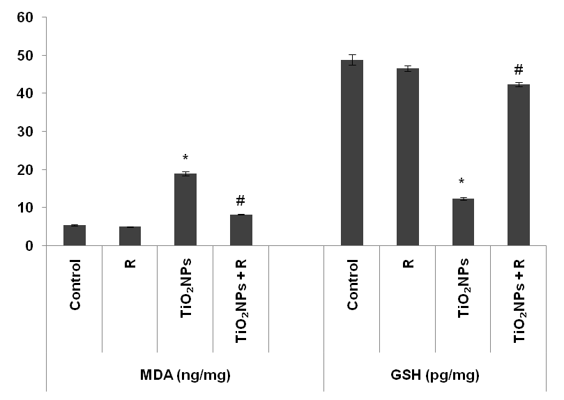 Fig. 2: Effect of rutin (R) on malondialdehyde (MDA) and reduced glutathione (GSH) levels, in renal homogenate of titanium dioxide nanoparticles (TiO2NPs)-treated mice. Data are expressed as mean±standard error (n=10). *P<0.05: significant difference from the control group, #P<0.05: significant difference from the TiO2NPs treated group