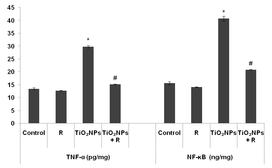Fig. 3: Effect of rutin (R) on nuclear factor kappa B (NF-κB) and tumor necrosis factor-α (TNF-α) levels in renal homogenate of titanium dioxide nanoparticles (TiO2NPs)-treated mice. Data are expressed as mean±standard error (n=10). *P<0.05: significant difference from the control group, #P<0.05: significant difference from the TiO2NPs treated group