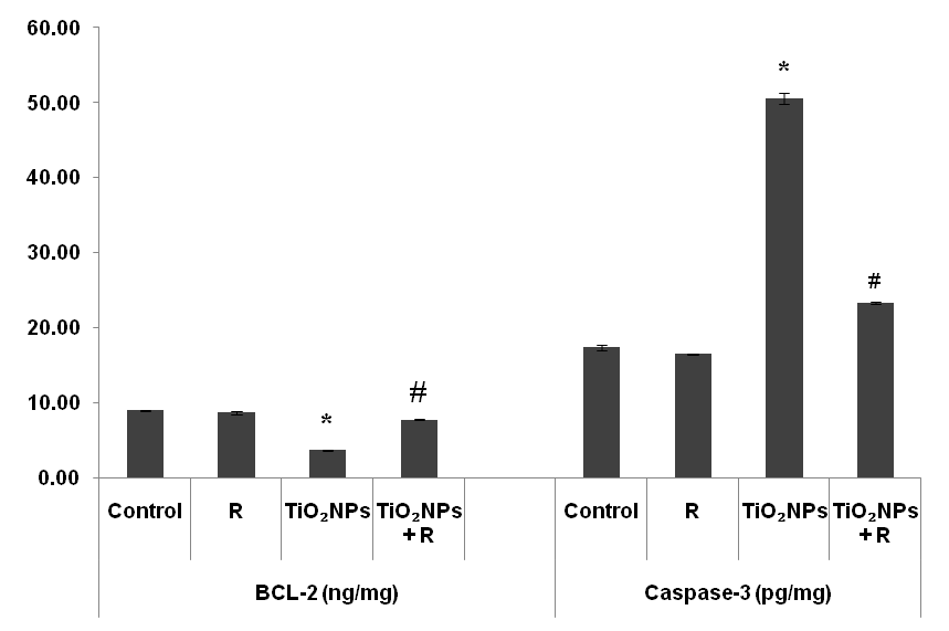 Fig. 4: Effect of rutin (R) on B-cell lymphoma (BCL(-2 and caspase-3 levels in renal homogenate of titanium dioxide nanoparticles (TiO2NPs)-treated mice. Data are expressed as mean±standard error (n=10). *P<0.05: significant difference from the control group, #P<0.05: significant difference from the TiO2NPs treated group