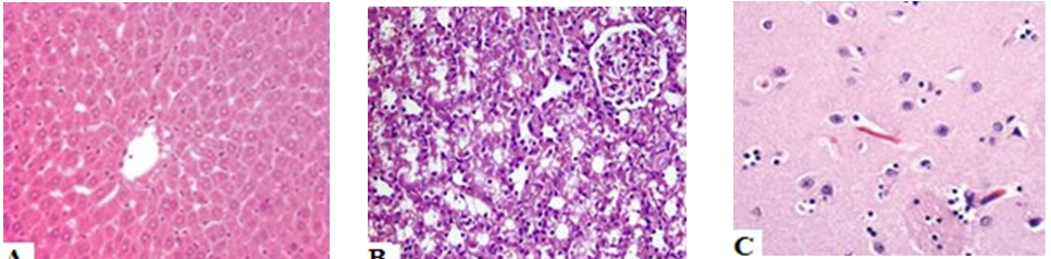 Fig. different histological specimens of experimental rats (H and E, ×400) (a) liver, (b) kidney and (c) brain, show normal tissues with non-remarkable changes with control specimens.