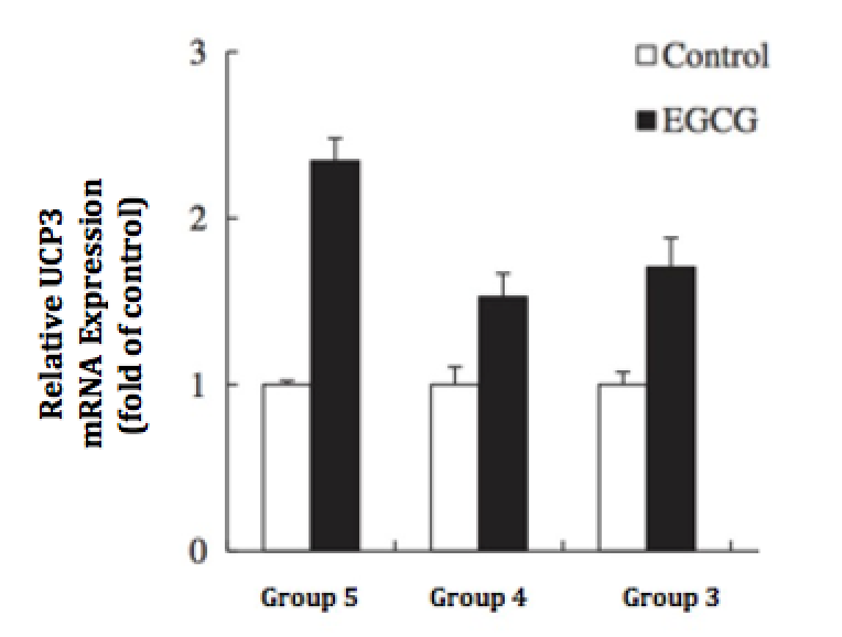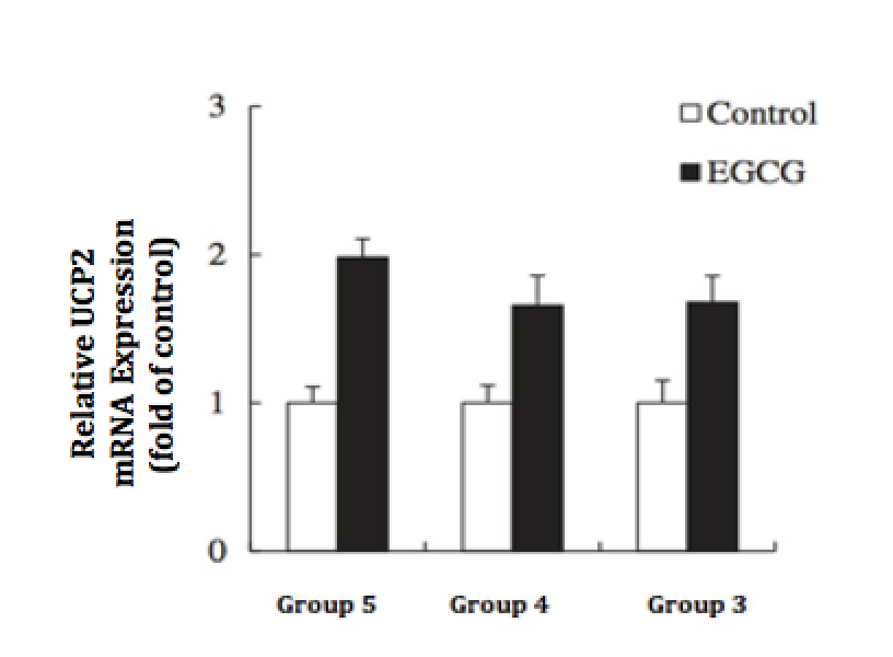 Fig. 7: Relative messenger RNA (mRNA) levels of UCP-3 gene, relative messenger RNA (mRNA) levels of UCP-3 gene in brown adipose tissue of rat in epigallocatechin-3-gallate (EGCG) groups in relation to control groups