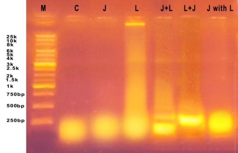 Fig. 1: DNA fragmentation detected with agarose gel of DNA extracted from hepatic tissues of rats treated with lannate in the absence and presence of orange juice, to show the shadowing smear of fragmented DNA in the studied groups. Lane M: somatic DNA ladder; Lane C: control group, showed intact band of DNA; Lane J: orange juice-treated group, also showed intact band of DNA; Lane L: lannate-treated group, showed higher degree of DNA damage; Lane J+L: orange juice-treated group prior to lannate, showed moderate degree of DNA damage; Lane L+J: lannate-treated group prior to orange juice, showed slight degree of DNA damage and Lane J with L: orange juice-treated group plus lannate, showed no DNA damage
