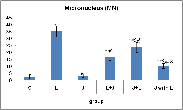 Fig. 3: Histogram of micronuclei percentage in polychromatic erythrocytes in bone marrow of experimental rats. Values are presented as mean±SD. *: statistically significant compared to corresponding value in C group (P≤0.05), #: statistically significant compared to corresponding value in L group (P≤0.05), $: statistically significant compared to corresponding value in J group (P≤0.05), @: statistically significant compared to corresponding value in L+J group (P≤0.05), and: statistically significant compared to corresponding value in J+L group (P≤0.05)