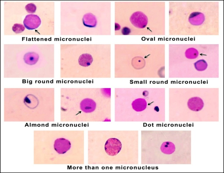 Fig. 4: Different forms for the micronuclei in polychromatic erythrocytes observed in bone-marrow of experimental rats exposed to lannate (Giemsa stain, 1000×)