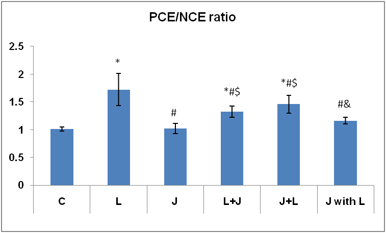 Fig. 5: Histogram of PCE/NCE ratio in the bone marrow of rats. Values are presented as mean±SD. *: statistically significant compared to corresponding value in C group (P≤0.05), #: statistically significant compared to corresponding value in L group (P≤0.05), $: statistically significant compared to corresponding value in J group (P≤0.05), and: statistically significant compared to corresponding value in J+L group (P≤0.05)