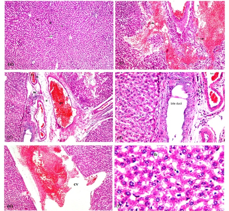Fig. 6A: Liver paraffin sections stained by haematoxylin and eosin (HandE) for histopathological changes induced by lannate. (a) normal control liver, (b-f) liver treated with lannate. The magnification power was 100x in fig. number (a), (b), (c), and (e) while it was 200x in fig. number (d) and 400x in fig. number (f)