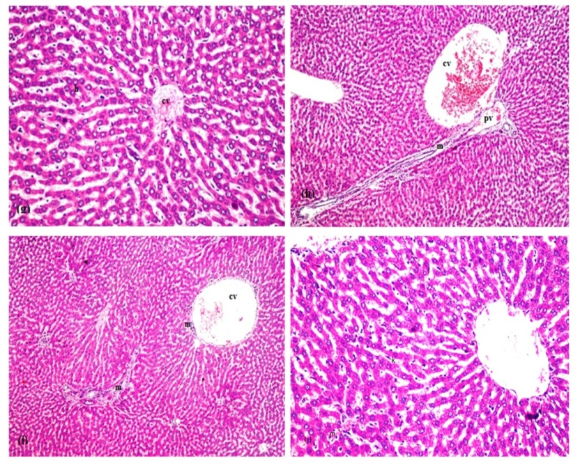 Fig. 6B: Liver paraffin sections stained by H and E showing ameliorated hepatic architecture in the orange juice treated groups with or without lannate. (g) orange juice treated group, (h) post-treatment group, (i) pre-treatment group, (j) continuous group. The magnification power was 100x in fig. number (h) and (i) while it was 200x in fig. number (g) and (j)