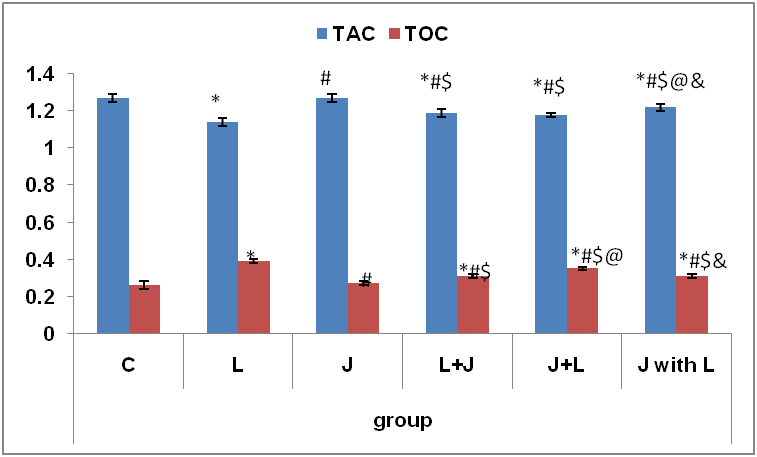 Fig. 7: Histogram of TOC and TAC concentration (mmol L−1) in the serum of experimental rats. Values are presented as mean±SD. *: statistically significant compared to corresponding value in C group (P≤0.05), #: statistically significant compared to corresponding value in L group (P≤0.05), $: statistically significant compared to corresponding value in J group (P≤0.05), @: statistically significant compared to corresponding value in L+J group (P≤0.05), and: statistically significant compared to corresponding value in J+L group (P≤0.05)