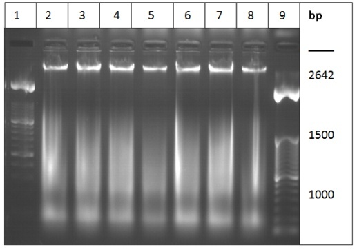 0.7 v/v) at -20°C for 1 hour. After centrifugation (13,000 g at 4°C for 15 minutes), the supernatant was carefully decanted, and the Eppendorfs were left upside-down for 1 hour at room temperature. Finally, each pellet was dissolved in 10 µl of 1 X Tris-EDTA (10 ml of 1M Trice-HCl, pH = 7.6 and 2 ml of 0.5M EDTA, pH = 7.6 was added to 988 ml of dH2O filtered with 0.5-micron filtered and autoclaved). Also, to each pellet 1 µl of dye was added and electrophoresed on a 1.5% agarose gel containing ethidium bromide (final concentration 0.5µg/ml). A constant voltage of 90V was used for 70 minutes. Two microliters of different bp size DNA marker ladder were used in the left and right side of the gel as the controls. Ladder formation of DNA was detected under ultraviolet light and photographed.