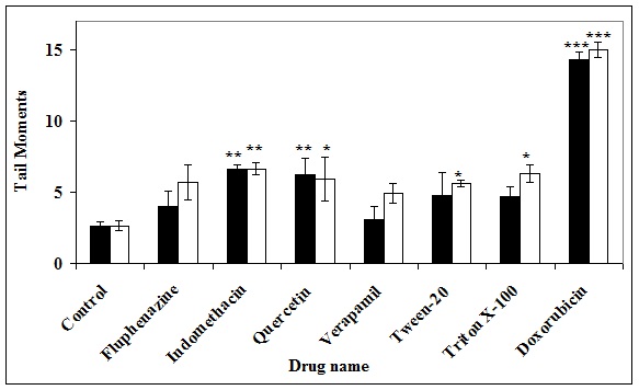 Data were analyzed through SPSS 13.0 for Windows and were compared by the Mann-Whitney test. Low damage induction to DNA occurred, which was measured by the SCGE assay (fig. 3). Except for indomethacin and quercetin, which showed significant differences, the other P-gp reversal agents showed limited DNA damage when compared with control cells. Doxorubicin increased the tail moments in both cell sub-lines (p < 0.001), indicating the effects of DOX in a nanomolar dose scale, and also inhibited the growth of both cell sub-lines, indicating the inhibitory effects of the drug.