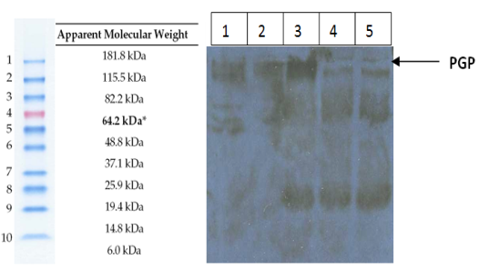 Fig. 7: The P-gp detection. Lane 1 = protein ladder, 2 = Raji (TK+), 3 = Raji (TK-), 4 = Caco-2 and 5 = human lymphocytes