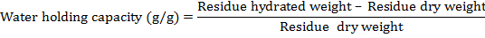 Water holding capacity, defined by the quantity of water that is bound to the fibre without the application of some external force (except for gravity and atmospheric pressure), was determined by accurately weighing dry sample (1 g) into a graduated test tube, and adding around 30 ml of water, and it was allowed to hydrate for 18 h at ambient temperature. The supernatant was removed by passing through a sintered glass crucible (G4) under vacuum. The hydrated residue weight was recorded and it was dried at 1050C for 2 h to obtain the residue dry weight.