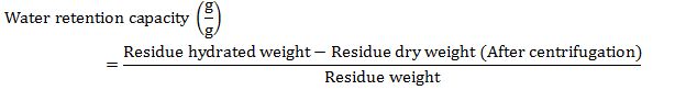 Water retention capacity, defined as the quantity of water that remains bound to the hydrated fiber following the application of an external force (pressure of centrifugation) was determined by accurately weighing dry sample (1 g) into a graduated centrifuge tube, adding 30 ml of water and it was hydrated for 18 h, centrifuged (3000g, 20 min) and the supernatant solution was removed by passing through a sintered glass crucible (G4) under applied vacuum. The hydrated residue weight was recorded and then the sample was dried at 1050C for 2 h to obtain its dry weight.