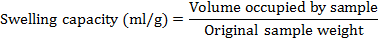 Swelling capacity is defined as the ratio of the volume occupied when the sample is immersed in excess of water after equilibration to the actual weight. Accurately weighed dry sample (0.2 g) was placed in a graduated test tube, around 10 ml of water was added and it was hydrated for 18 h, and the final volume attained by the sample was measured.