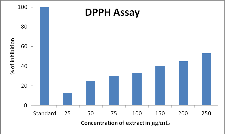 The plant extracts possess potent antioxidant activity as in DPPH assay the extract could inhibit 50% of the activity at a concentration of 250 µg/ml (fig. 2) and in ABTS at a concentration of 600 µg/ml(fig. 3).