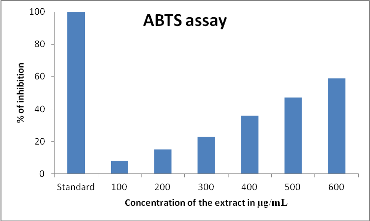 Different concentrations of plant extract and ascorbic acid [standard] were weighed separately and dissolved in DMSO solution. The test sample contains 1 ml of distilled DMSO and 0.2 mL of various concentrations of plant crude extract or standard, 0.16 mL of ABTS was added. After 20 min absorbance was measured spectrophotometrically at 734 nm.