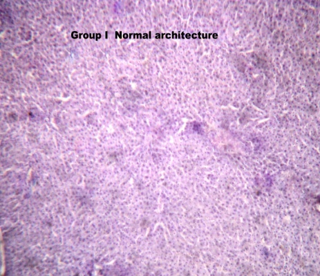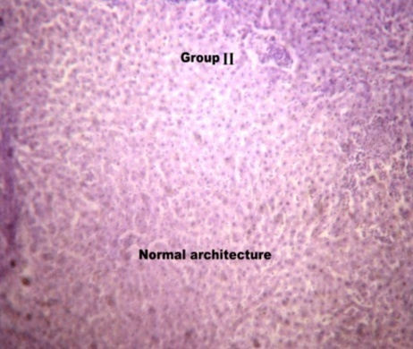 | Histopathological view of a liver section of group I rats | Histopathological view of liver section of group II rats |