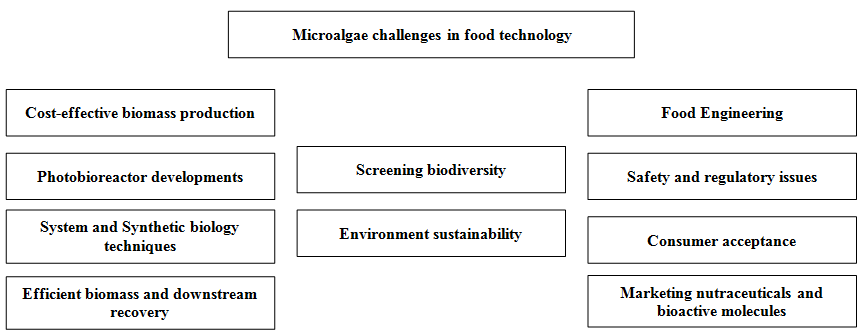An international organisation reports that approximately 805 million people have been undernourished chronically in 2012-14 by more than 100 million over the past decades and 209 million since 1990-92 according to the latest Food Agricultural Organisation (FAO). But, in the world, about 1 in every 9 individuals still has insufficient food for a healthy and active life that leads to malnutrition. India harbours the largest consumers of antibiotic and among the largest carrier of drug-resistant pathogens [34]. With the growing population, the production of nutritious as well as the necessary quantity of food is an eternal challenge. The United Nations Development Programme (UNDP) sustainable goals to be intended to be met by 2030, including wellbeing, good health, zero hunger and no poverty and clean and affordable energy demands an efficient source of nutrients. In order to meet the demands and to achieve UNDP goals, metabolomics is one of the key tools for nutrition research [35]. The two important deciding features of the so-called nutritional environment are both production and quality. From governments to ordinary individuals, the concern of nutritional environment lies at the centre of everybody’s attention. With the increasing world’s population, there is also growing concerned to find solutions to feed these populations. To respond, in the last few decades, researchers are turning to non-conventional ways for food sources including “alga culture”-the farming algae for human consumption. For instance, six species of Spirulina have been reported and taxonomically characterised by Brahmaputra valley of Assam, North-East India [36]. Experts suggest the potential of Spirulina to tackle India’s malnutrition. However, to develop and market value-added products from microalgae, food industries face several challenges, as shown in fig. 5. To overcome those challenges, and to develop and bring many innovative products and processes into the North East market, several initiatives have been adopted from the government. Recently Council of Scientific and Industrial Research, CSIR-CFTRI, Centre Food Technology Research Institute signed an MoU (Memorandum of Understanding) with Agricultural and Processed Food Products Export Development Authority (APEDA) for opening up a liaison office at Guwahati, Assam India. This agreement will further improve the sector of value addition to food industries including employing microalgae such as Spirulina cultivation.