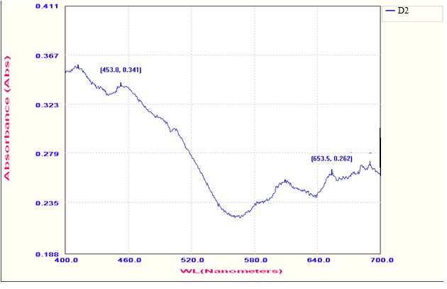 In the present study compound D2, obtained as a pale yellow colour crystals (hRf: 86.66) in TLC (ethyl acetate: methanol, 7:3) and melting point was recorded as 136-138 °C. UV spectrum showed UVλmax nm wavelength at 653.5 and absorbance at 0.262 (fig. 1). The FTIR spectrum shows the presence of broad main absorption band of Hydroxyl group (-OH) at 3358 cm-1 and additional moderate intense bands 1059 cm-1, 1275 cm-1 and 1360 cm-1 present between the ranges (600 cm-1-1600 cm-1). Band 2930 cm-1 is due to stretching (C-H) and 1652 cm-1shows stretching of C=N group (fig. 2). The Mass spectrum indicated the molecular ion peak at m/z 267 and base ion peak at m/z 191(fig. 3). Its molecular formula was assumed as C17H17NO2 and molecular weight is 267.33. The 1H NMR spectrum of compound D2 showed signal at δH 8.20 (1H, dd, J= 4Hz), and multiplet between δ 7.77-7.19 characteristic to aromatic protons, one methoxy protons [δH 3.95(3H,S)], two methyl and hydroxyl protons exhibited signals between [δH 2.0 (1H, br S)-1.27(3H,S)]. The physico-chemical properties and spectroscopic data indicated that compound D2 as alkaloid and considering the comparative results of spectral studies and structure of D2 was predicted as, 2-(6-methoxyphenanthridin-8-yl) propan-2-ol as shown in fig. 4. These spectroscopic data support the proposed structure D2 (fig. 4, table 1). The structure of compound was established on the basis of spectroscopic studies.
