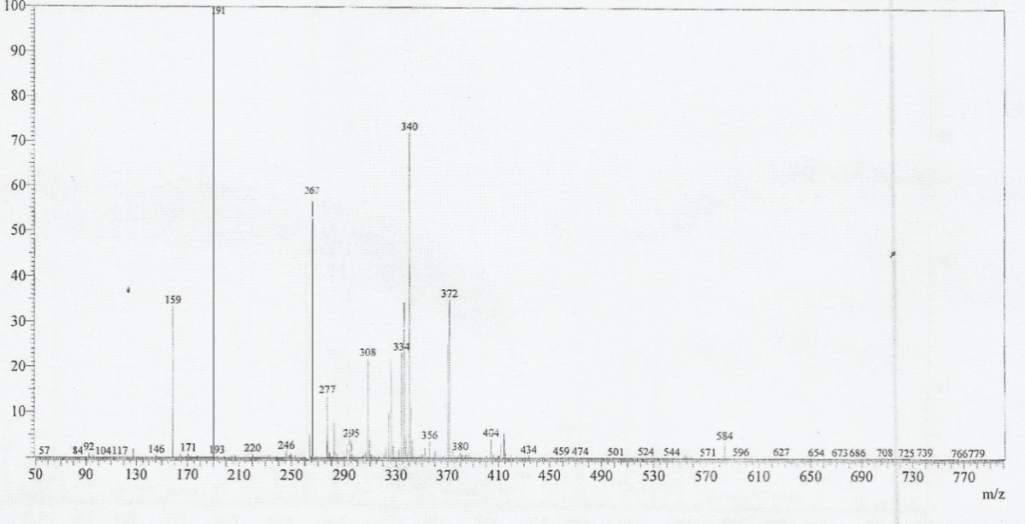 Melting point of obtained fraction was determined by Thiele tube melting point apparatus. A UV/VIS spectrum was obtained in the range of 200-800 nm wavelengths using a 5704SS ELICO spectrophotometer. The Fourier transform infrared (FTIR) spectrum was measured with a KBr discs in wave numbers (cm-1) in the range of 4000-450 cm-1 recorded as inverted peaks using Perkin-Elmer RX1 spectrophotometer. Obtained fraction was subjected to mass spectrometry analysis (MS) to determine molecular ions present in isolated compound. Fraction was analyzed and measured in CDCl3 (denaturated chloroform, DMSO) with a Shimadzu MS 2010 A (temperature of 27 °C) using M-nitrobenzyl alcohol (NBA) as matrix. The retention index was determined relative to the retention times in JEOl Model GSx 400 spectrometer. NMR was performed to determine the structure of the compound, 1HNMR was recorded using Bruker AMX 400 NMR spectrometer at 300K in CDCl3 and chemical shift was recorded in δ (ppm) and J in hertz value relative to Tetramethyl saline (TMS) as internal reference at 400.137 MHz.