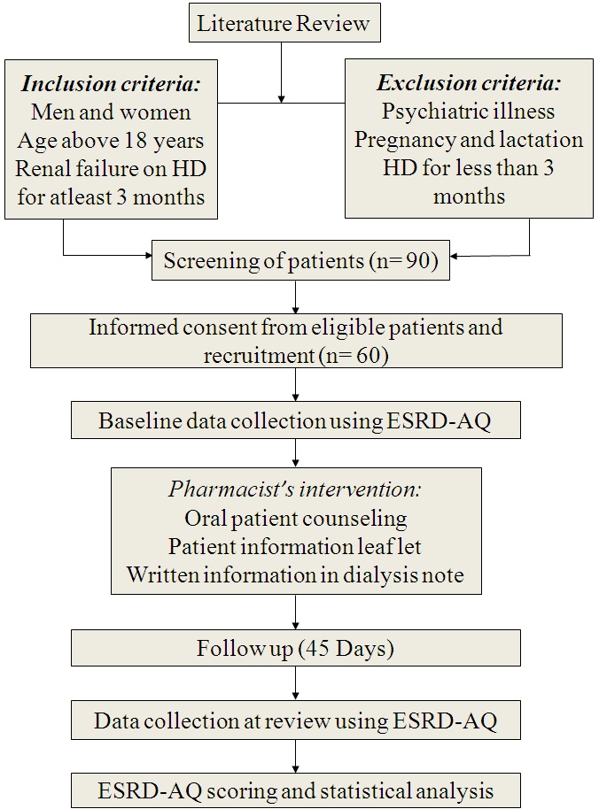 After baseline interview, pharmacist’s intervention which included oral counseling once in two weeks (total 3 sessions) was provided. In addition to oral counseling, printed information leaflets and written information on dialysis note in regional language were provided to the patients. After the follow-up period of 45 days, patients were reviewed and reassessed by using ESRD-AQ.