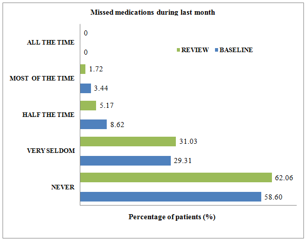 Medication adherence was assessed at the baseline and after follow up. At baseline interview 58.60% of the patients reported that they have never missed the medications during the past week. On review 62.06% of study subjects reported that they never missed the medications (fig. 2). Statistical significance was not seen since P value was found to be 0.053. Reasons for medication non-compliance were also recorded (table 4).