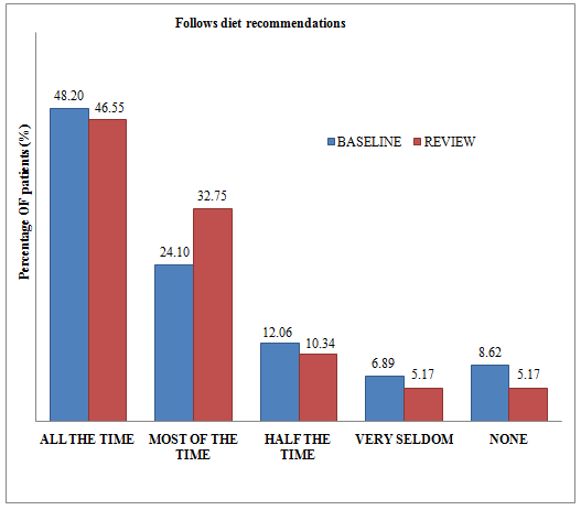 In this study we observed that at baseline 48.20% of the patients were adherent to diet recommendations all the time and 8.62% never followed the diet recommendations. On review 46.55% of study population reported that they were adherent to the diet all the time. But improvement was observed in patients who follow diet recommendations most of the time (24.10% at baseline, 32.75%) and number decreased among patients who reported that they never follow diet recommendations (5.17%). P value was found to be 0.053 which was statistically non significant but the results obtained indicate improvement. (fig. 3)