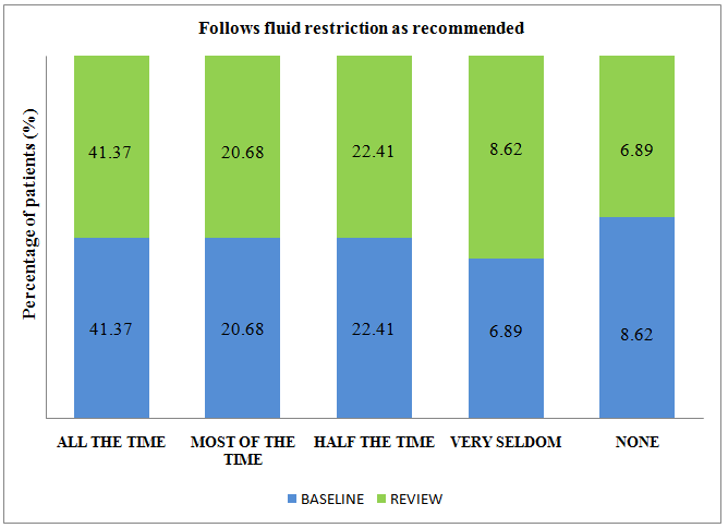 In this study, patient compliance towards fluid restriction was found to be poor when compared to other treatment aspects. At baseline interview 41.37% of patients reported that they were adherent to fluid restriction all the time 8.62% of the patients never followed fluid restriction. Marginal improvement was seen but there was no statistical significance observed as P value was 1.00. (fig. 4)