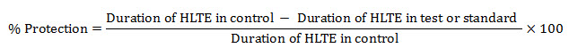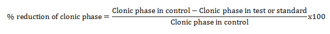 The mice were subjected to an electrical stimulus of 50 mA of alternating current from the electroconvulsiometer for 0.2 sec via ear clip electrodes. The resulting seizure passed through different phases-tonic flexion, tonic extension, clonic convulsions, stupor, and recovery or death [14]. The reduction or complete of abolition of HLTE phase was considered as protection action against convulsion [15]. The HLTE phase and its percentage protection were assessed. The percentage of protection was calculated using the following equation [16].