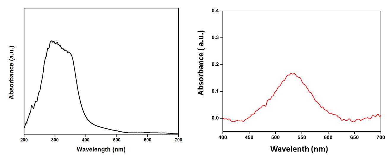 The end product obtained after the chemical and green synthetic routes was black IONP, confirmed initially by UV-Vis Spectroscopy. Research suggests that when the size of a nanoparticle decreases the absorption edge is shifted to shorter wavelengths [13]. IONP prepared by green route showed an absorption maximum at 303 nm (fig. 1A) while nanoparticles synthesised by chemical route exhibited a surface plasmon resonance at 523 nm (fig. 1B). The difference in scale could be attributed to the relatively less particle size of IONP synthesised via the green route.