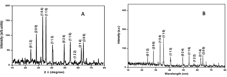A & B X-Ray Diffractometry of IONP (Rigako instrument) synthesised by green and chemical were measured and showed sharp diffraction peaks at 2θ angles of 24.2 °, 32.2 °, 54.1 °, 40.9 °, 49.5 °, 57.3 °, 62.5 ° and 64.0 ° corresponding to the hkl values from (012), (104), (116), (113), (024), (122), (214), (300) crystal planes respectively.