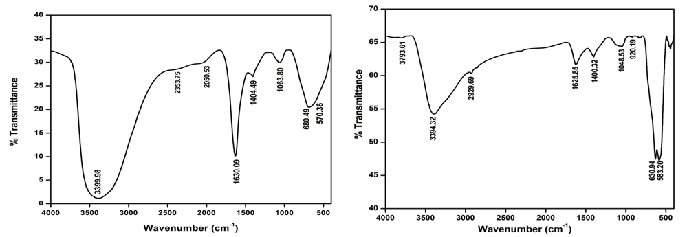(A) Fourier Transform Infrared Spectroscopy of green IONP (Perkin Elmer spectrum 1) were measured between 400-4000 cm-1showing broad peaks at 3399.98 cm-1, 1630.09 cm-1, 1404.49 cm-1, 1063.80 cm-1, 680.49 cm-1 (B) Fourier Transform Infrared Spectroscopy of chemical IONP (Perkin Elmer spectrum 1) was measured between 400-4000 cm-1showing peaks at 3394.32 cm-1, 2929.69 cm-1, 1625.85 cm-1, 1404.32 cm-1, 583.20 cm-1