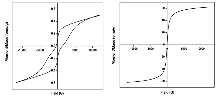 (A) VSM of green IONP shows highest saturation magnetism at 0.51 emu/g (B) VSM of chemical IONP shows highest saturation magnetism at 60 emu/g