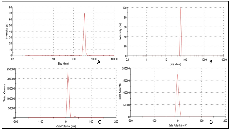 (A) Size distribution of chemical IONP showing average size as 331.1 nm (B) Zeta potential analysis of chemical IONP showing maximum at+9.05 (C) Size distribution of green IONP with average size as 58.77 nm (D) Zeta potential analysis of green IONP showing maximum at-1.37