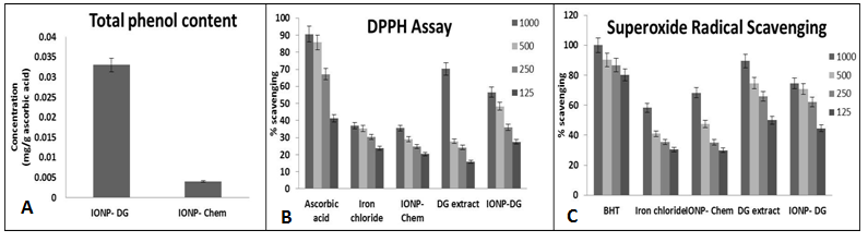 (A) Total phenol content of chemical and green IONP (B) DPPH assay showing comparative antioxidant potential of chemical and green IONP, Iron chloride, DG extract, and ascorbic acid (Positive control) (C) Superoxide Radical Scavenging assay showing comparitive antioxidant potential of chemical and green IONP