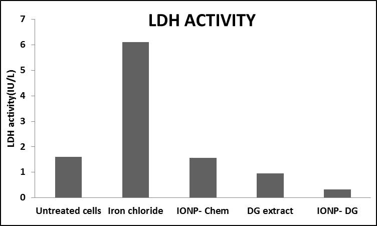 The graph shows LDH activity of untreated cells, Iron chloride, chemical IONP, DG extract, green IONP. Treatments were made once the seeded cells reached 80% confluence. The results are expressed as mean SD of n=4-6 independent assays, p<0.05, statistically different from the normal control group.