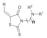 Design, synthesis and development of pharmaceutically active molecules have always been a primary objective of medicinal chemistry. Treatment of infectious diseases is a challenging task for researchers and due to the increasing number of multidrug-resistant microbial pathogens, the discovery of new molecules to combat drug resistance is always a necessity [1-6]. The existing antimicrobial drugs for the treatment of infectious diseases are insufficient to protect us for the long term because of an increasing number of resistant strains. Hence there is an emergent need for the development of newer antimicrobial agents with a new mode of action. Rhodanines are accepted as advantaged heterocycles in medicinal chemistry as one of the 4-thiazolidinones subtypes [7-11]. Thioxo-thiazolidinone (Rhodanine) and its derivatives [12, 13] are reported to have a broad spectrum of biological activities such as antibacterial [14-19], antifungal [20-22], anti-diabetic [23, 24], anti-tubercular [25-27] anticancer [28, 29] anti-HIV [30-38] and antimalarial [39]. Rhodanine derivatives have been investigated for Alzheimer’s disease also [40, 41]. Rhodanine (2-thioxothiazolidin-4-one) can be used for chemical modifications such as N-3 and/or “active methylene” C-5 substitution can be found that are capable of generating potential for new bioactive compounds [42, 43]. We, therefore, took up designing new chemical entity of 3-[(dialkylamino) alkyl]-2-thioxothiazolidinone (fig. 1) by substituting various benzylidene derivatives at 5th position and the evaluation of their in vitro antimicrobial activity. In this study, we report in vitro activity of some very potent 3-(dialkylamino) alkyl substituted rhodanine derivatives.